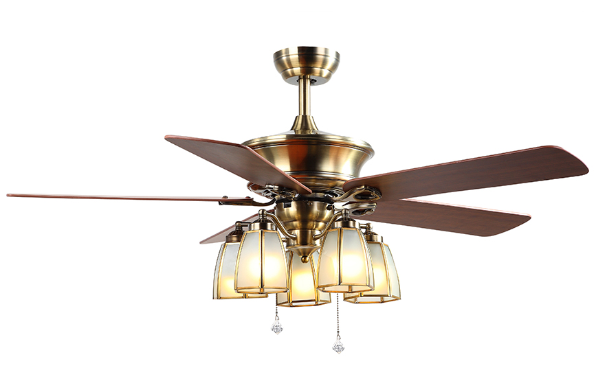 52寸/1320mm;五叶/进口合板木叶;五灯/E27+铜灯玻璃;拉线/遥控控制。