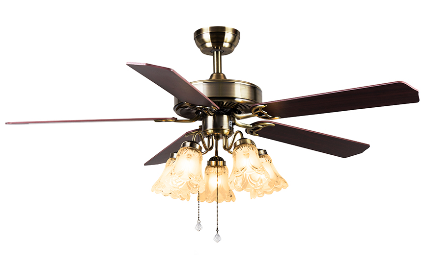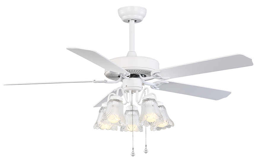 52寸/1320mm;五叶/进口合板木叶;五灯/E27+白色浪珠玻璃;拉线/遥控控制。